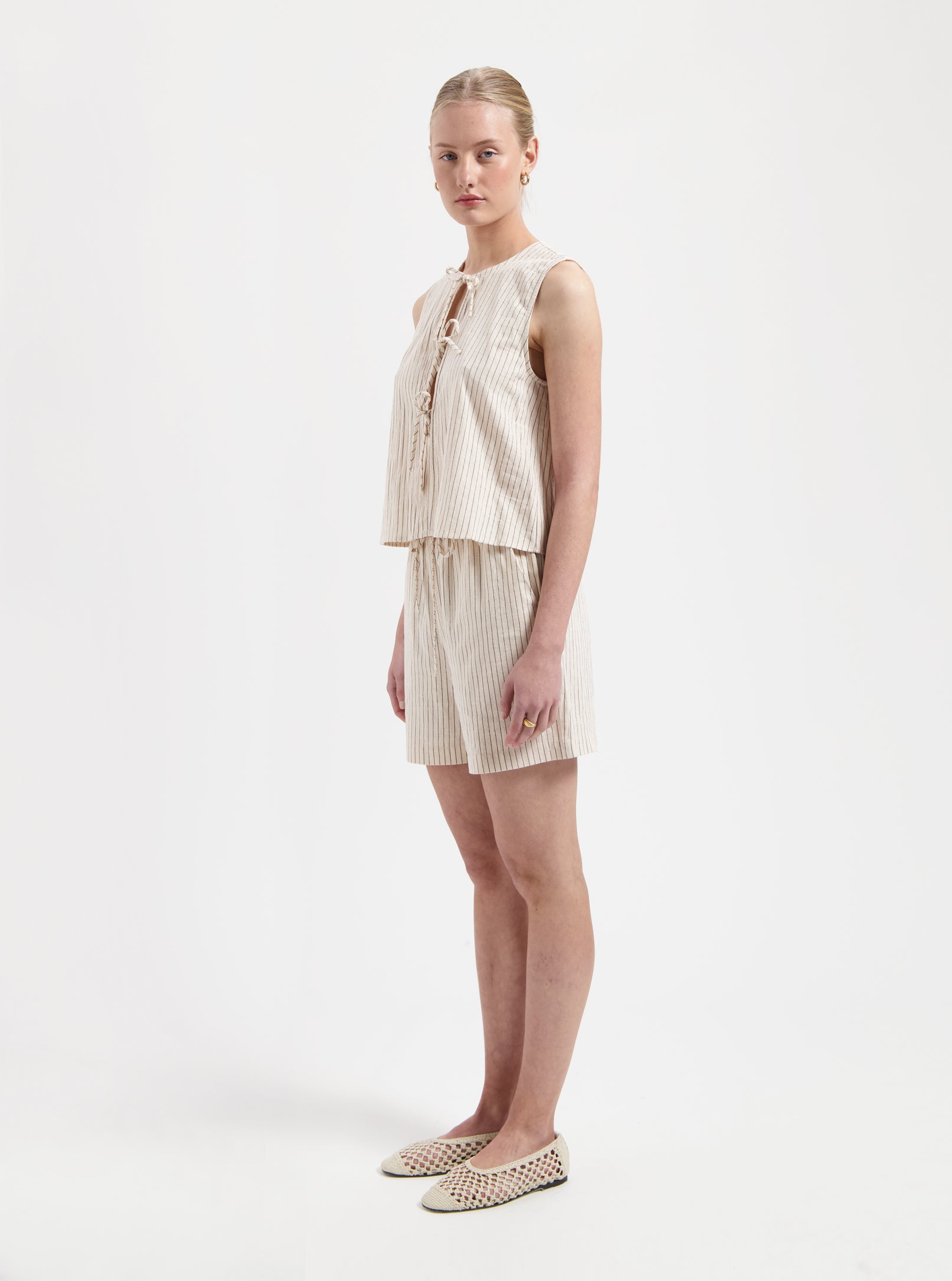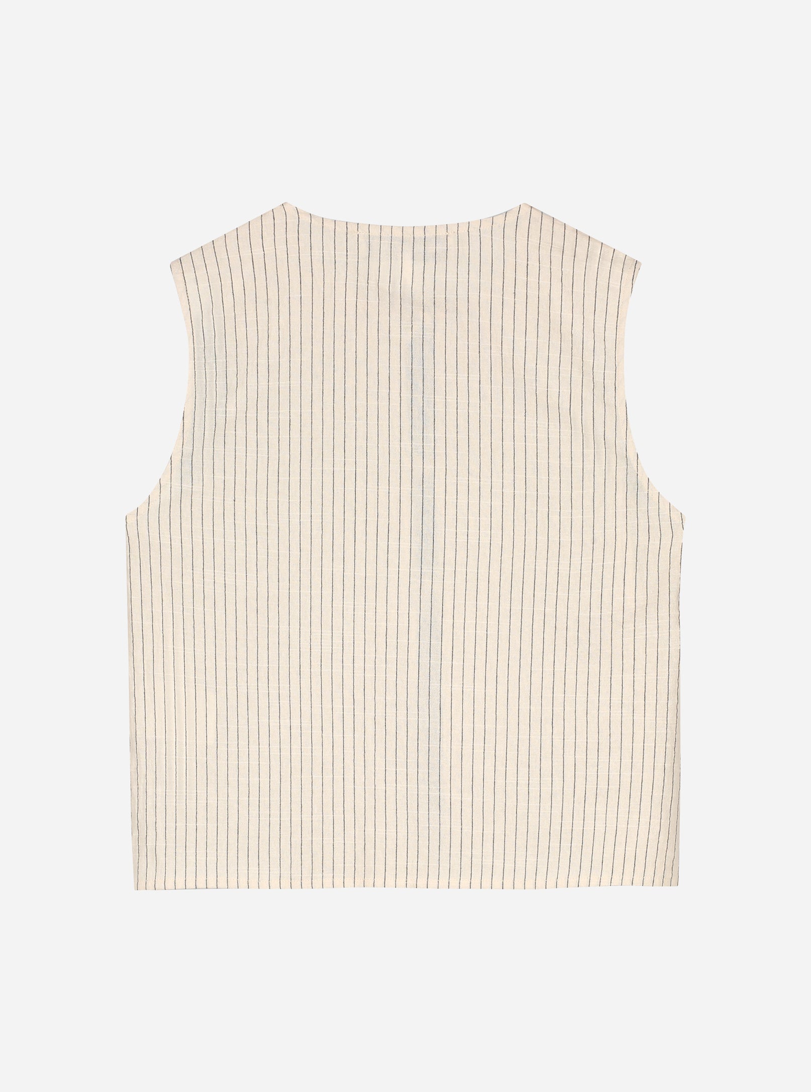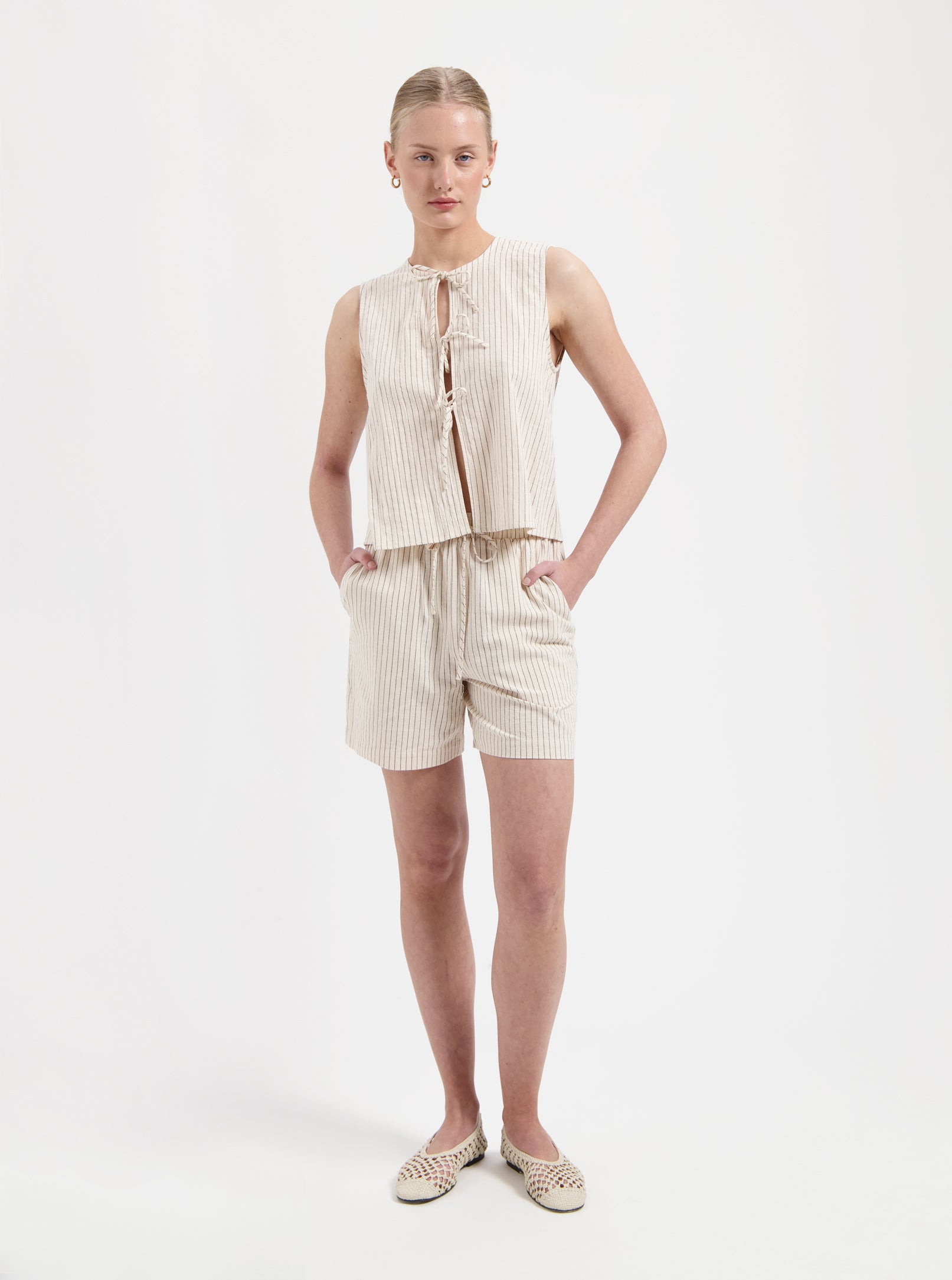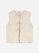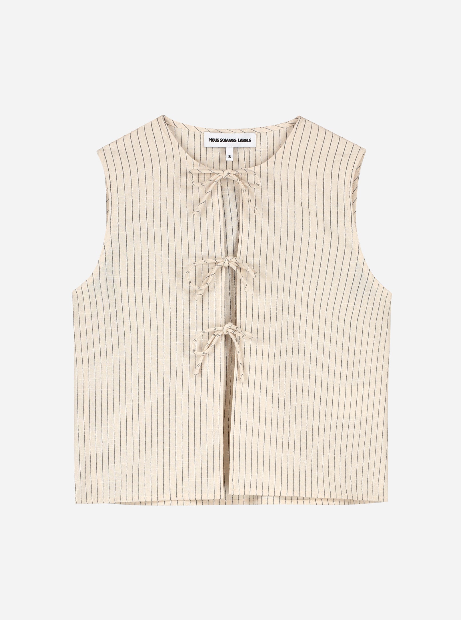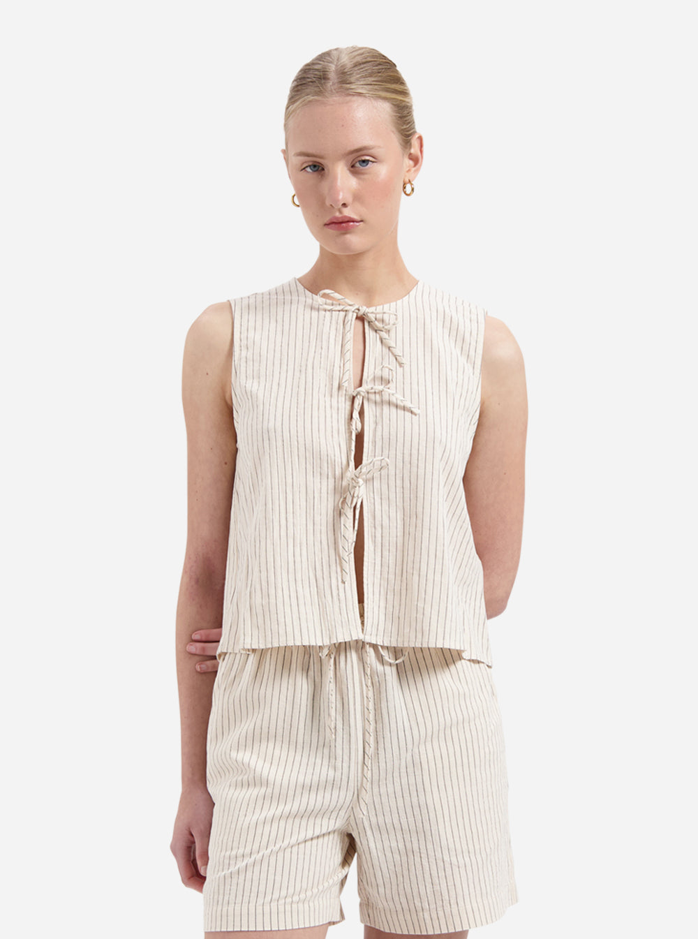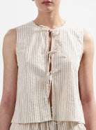 Effortlessly chic and timeless, the Sophie Top in off-white is a must-have for warm-weather styling. Featuring delicate vertical stripes and an open front secured with dainty tie closures, this sleeveless top brings a relaxed yet refined aesthetic. Crafted from breathable, lightweight fabric, it ensures comfort while adding a touch of elegance to any outfit. Pair it with matching shorts or your favorite denim for an effortlessly stylish look.